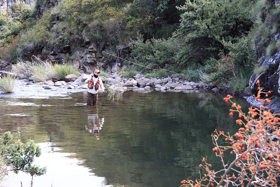 As you move up from the house, the river goes from medium to tiny to minute. The views are spectacular, you are right in the heart of the ‘Berg in the middle of nowhere surrounded by Vultures and horses. On this beat it definitely is not just about the fishing and the scenery will truly take your breath away. The majority of fish aren’t very large, but size looses all significance when fishing in this area. The river is fast flowing, with crystal clear water and eager trout. This beat allows the small stream enthusiast to really eat his/her heart out; dry flies, light weight tackle and super-fine tippets. This is a real mountain stream and hiking becomes a must on this beat, so be warned. There is a lot of everything on this beat, but everything is of Lilliputian scale; pools, riffles, runs, pocket water etc. Sight fishing becomes mandatory and with the size of the trout population up here you are sure to have a great day’s fishing. You can fish this beat all the way from the beginning of the far till where the Bokspruit disappears into the mountain side and is but a mere trickle. A real must if you have the time. But beware, the road to Gateshead is in a poor state of repair necessitating the use of a vehicle with high clearance. Wet weather demands the capabilities of a four wheel driven vehicle.