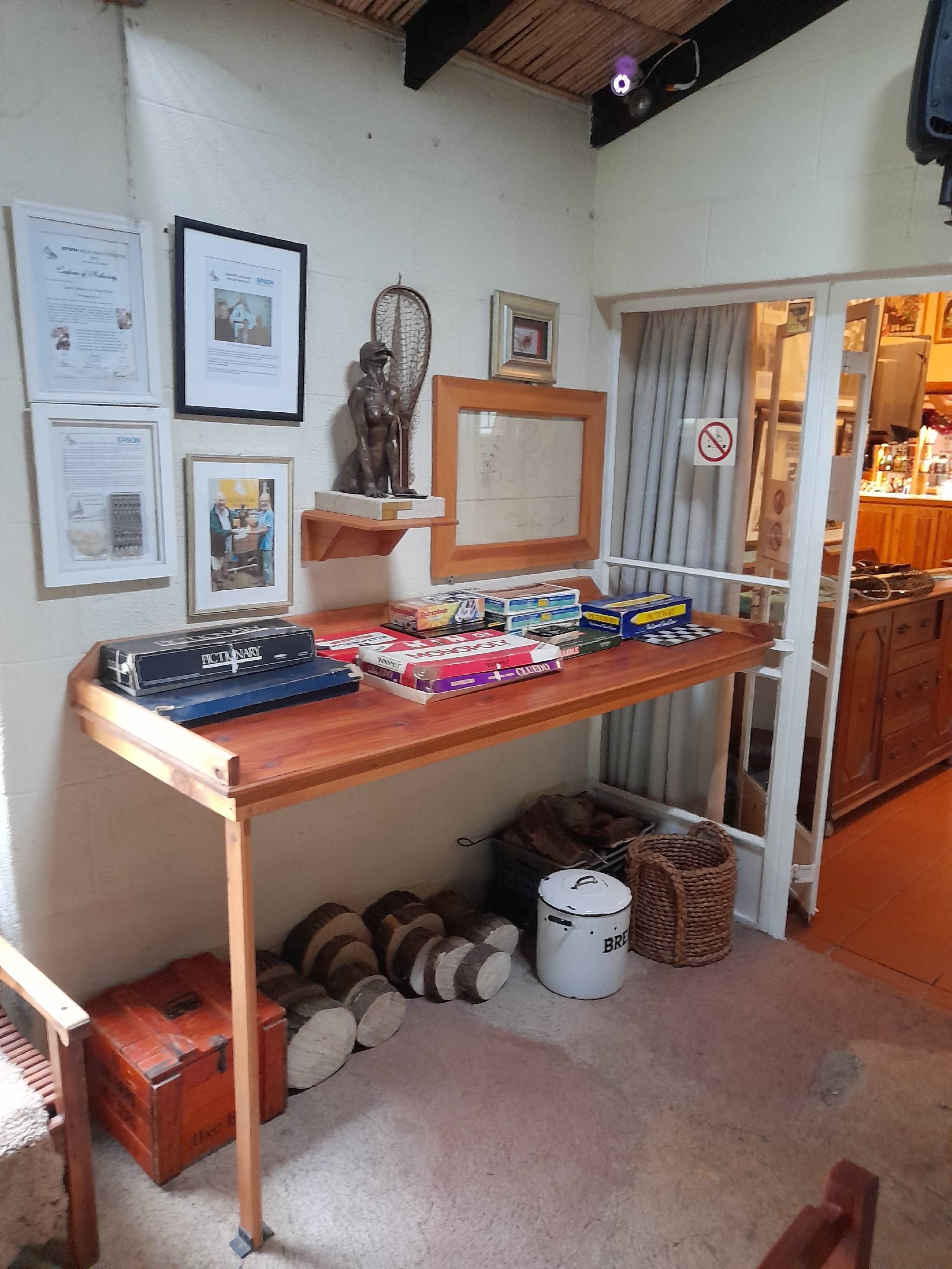Toms’ Corner featuring the framed mural drawn in 2012 and various other fly-fishing memorabilia. The shelf was made of timber from one of the trees felled to make way for the Sunroom extension at Walkerbouts Inn.