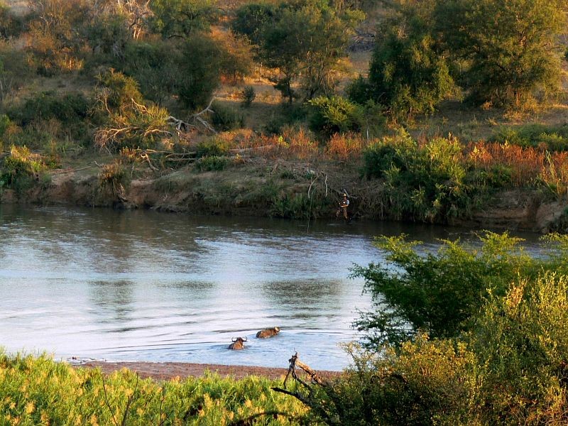 A good day’s buff fishing, provided the wind doesn’t swing the wrong direction and the herd is feeding well, should see you net two, maybe three buffs, each weighing around a ton, or 10 feet long, though occasionally I’ve had them over 12 feet in the Stofkraal Corridor (where, incidentally, we have had big crocs on Rip Riphagen’s Sunken Guinea Fowl pattern fished on Kieckstardt’s handmade fine wire furled leaders and Bentley belt strike indicator).
